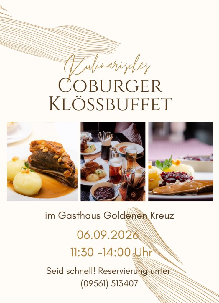 Am Sonntag, den 06. September 2026, findet im Restaurant Goldenes Kreuz in Coburg von 11:30 bis 14:00 Uhr das große Kulinarische Coburger Klößbuffet statt. Dieses besondere Event ist ein Muss für alle, die fränkische Spezialitäten in ihrer besten Form genießen möchten.