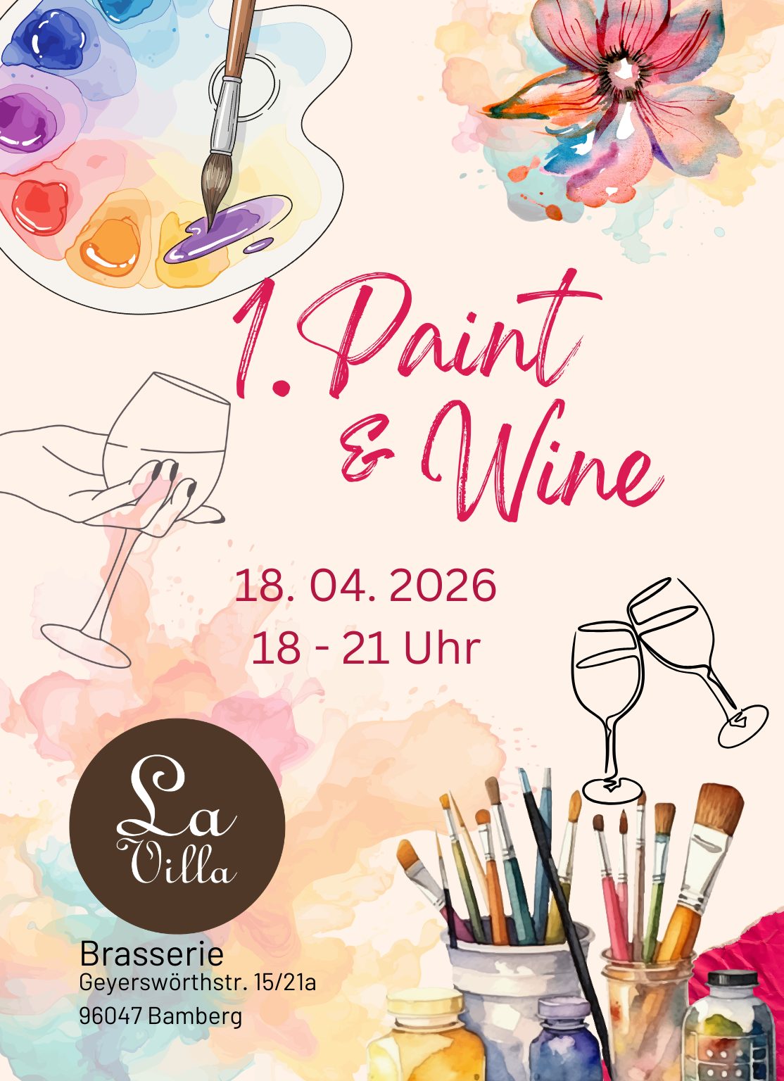 Kreieren Sie Ihr eigenes Kunstwerk unter künstlerischer Leitung von Stephan Welsch und wunderbarer Weinbegleitung von Markus Zimmer in der Brasserie La Villa Bamberg.